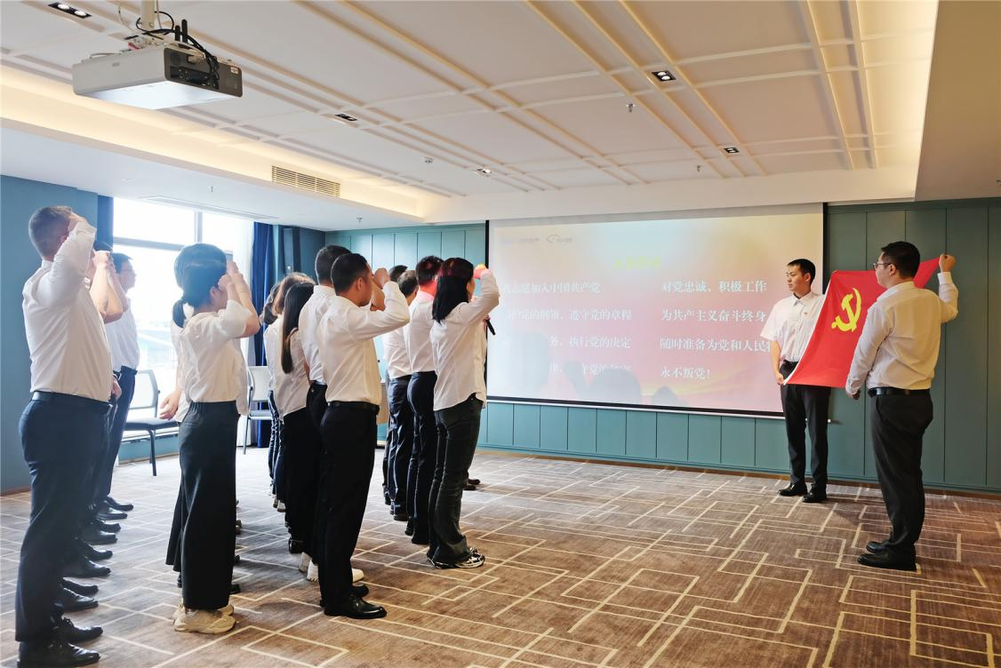 會議最后,全體黨員面向黨旗舉起右手莊嚴(yán)宣誓,重溫入黨誓詞。